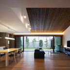 リビングの床を下げる事で、天井も高くなり、間仕切りや建具が無くても、ダイニングとのゾーン分けが出来ます。