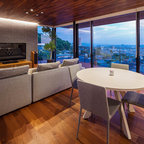 Inredning av ett modernt allrum med öppen planlösning, med vita väggar och grått golv — Houzz