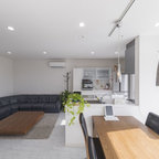 明るいナラ材とグレー、黒、白を組み合わせたインテリアが、優しくすっきりとした印象の大空間LDK。