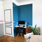 Inspiration för stora moderna hemmabibliotek, med vita väggar, heltäckningsmatta, ett fristående skrivbord och grått golv — Houzz
