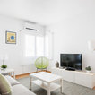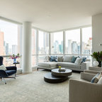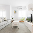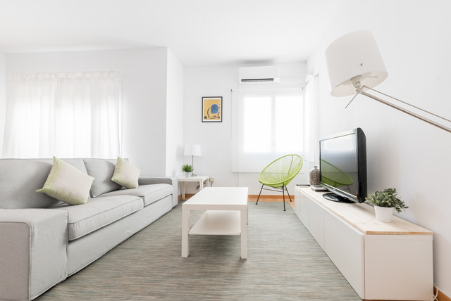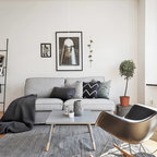 Bild på ett mellanstort nordiskt allrum med öppen planlösning, med ett finrum, vita väggar och en inbyggd mediavägg — Houzz