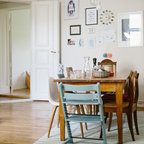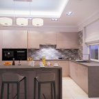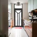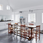 Foto på ett stort eklektiskt kök med öppen planlösning, med rostfria vitvaror, mellanmörkt trägolv, släta luckor, grå skåp, grått stänkskydd, en köksö och en enkel diskho — Houzz