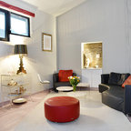 Inspiration för mellanstora moderna allrum med öppen planlösning, med vita väggar och mörkt trägolv — Houzz