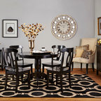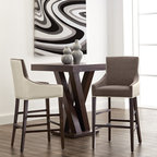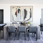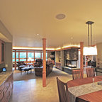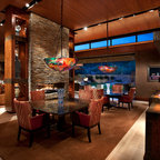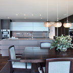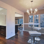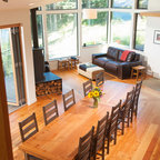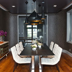Exempel på en modern matplats med öppen planlösning, med mellanmörkt trägolv och lila väggar — Houzz