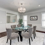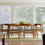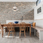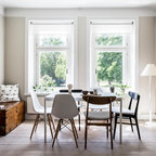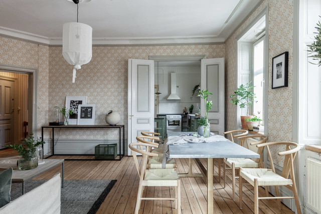 Bild på en mellanstor minimalistisk matplats med öppen planlösning, med flerfärgade väggar, ljust trägolv och beiget golv — Houzz