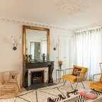 Foto på ett eklektiskt allrum med öppen planlösning, med flerfärgade väggar och mellanmörkt trägolv — Houzz