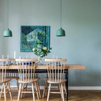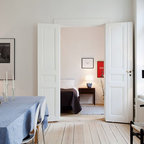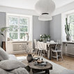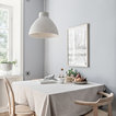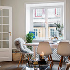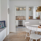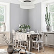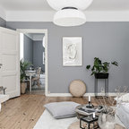 Idéer för mellanstora skandinaviska matplatser med öppen planlösning, med grå väggar och ljust trägolv — Houzz