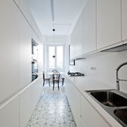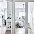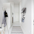 Inspiration för minimalistiska ingångspartier, med grå väggar, en enkeldörr, en vit dörr och brunt golv — Houzz