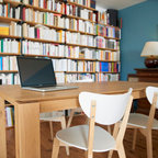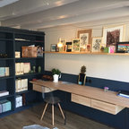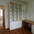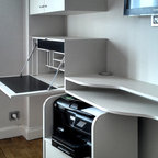 Inspiration för små moderna hemmabibliotek, med grå väggar, heltäckningsmatta och ett fristående skrivbord — Houzz