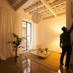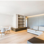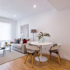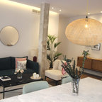 Salón joven y atrevido, en tonos azules y mostazas, combinando maderas claras, fresno y haya, con texturas naturales como el yute. Detalles en negro.