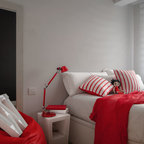 Inredning av ett skandinaviskt mellanstort allrum med öppen planlösning, med blå väggar, klinkergolv i keramik och en fristående TV — Houzz