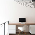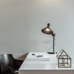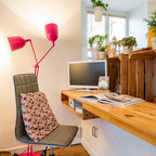 Inredning av ett nordiskt arbetsrum, med grå väggar, mellanmörkt trägolv, ett fristående skrivbord och brunt golv — Houzz