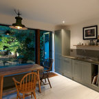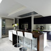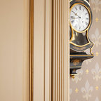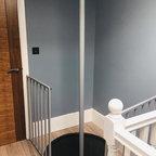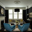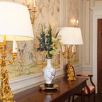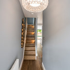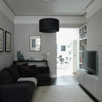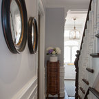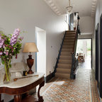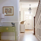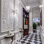 Classic monochrome hallway with bespoke Persian Grey marble topped console and Belgian Cafe Pendant light...