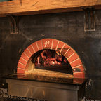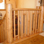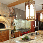 Bild på ett rustikt grå grått kök med öppen planlösning, med en undermonterad diskho, luckor med glaspanel, bruna skåp, fönster som stänkskydd, rostfria vitvaror, flera köksöar och ljust trägolv — Houzz