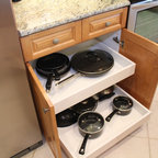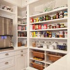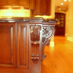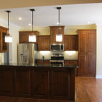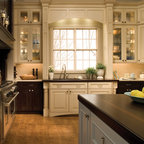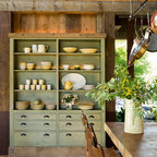I saved this picture because it might be super fun to do a paint grade back on the one glass cabinet and pick up a color from the granite. It will pop out better than doing a dark cabinet stain interior plus show off your glassware really nicely.