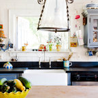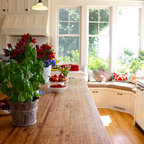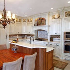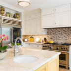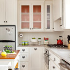 Idéer för vintage kök, med luckor med glaspanel, vita skåp, beige stänkskydd och stänkskydd i travertin — Houzz