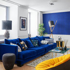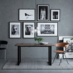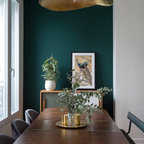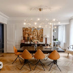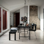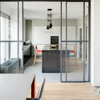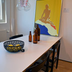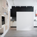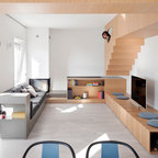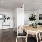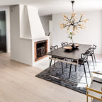 Inspiration för moderna matplatser med öppen planlösning, med ljust trägolv, beiget golv och vita väggar — Houzz