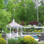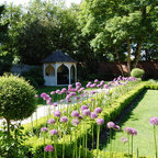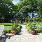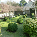 the stone floor round shaped greenery potted plants lush green walls soft grey spots of purple I might add a climbing beauty, such as a purple clematis.