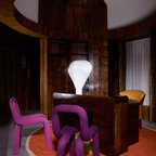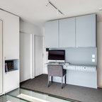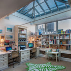 Bild på ett mellanstort funkis hemmabibliotek, med blå väggar, heltäckningsmatta och ett fristående skrivbord — Houzz