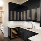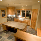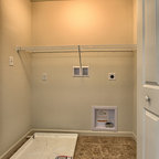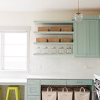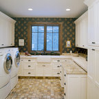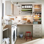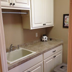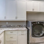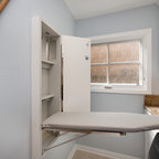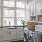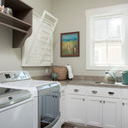 Inspiration för en vintage vita l-formad vitt tvättstuga, med grå skåp, luckor med infälld panel och en tvättmaskin och torktumlare bredvid varandra — Houzz