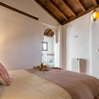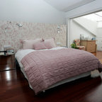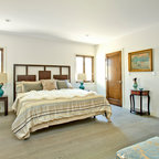 Shabby chic-inspirerad inredning av ett stort huvudsovrum, med beige väggar, mörkt trägolv och brunt golv — Houzz