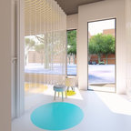 “En la zona de vestidor, una alfombra de pelo largo y cortinas que bailan a ras de suelo acaban de darle forma al conjunto”, cuenta la profesional sobre este dormitorio bonito y práctico.
