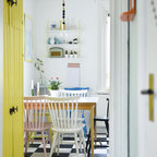 Idéer för att renovera en liten 60 tals matplats, med vita väggar och mellanmörkt trägolv — Houzz