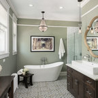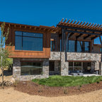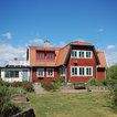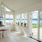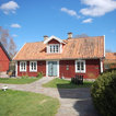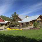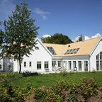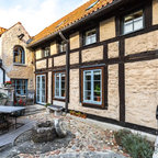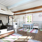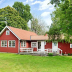 Foto på ett lantligt rött hus, med två våningar, mansardtak och tak i mixade material — Houzz