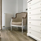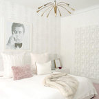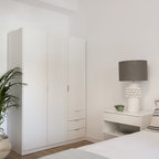 Bild på ett minimalistiskt gästrum, med vita väggar, mellanmörkt trägolv och brunt golv — Houzz