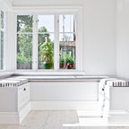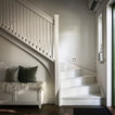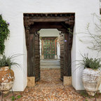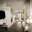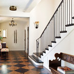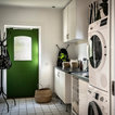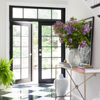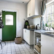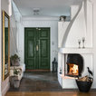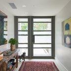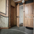 Klassisk inredning av en mellanstor hall, med vita väggar, grått golv, en dubbeldörr och en grön dörr — Houzz