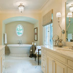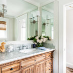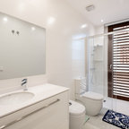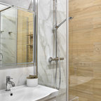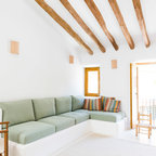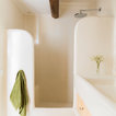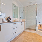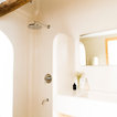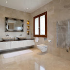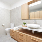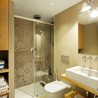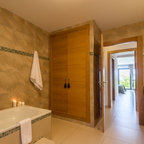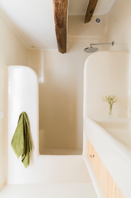 Foto på ett medelhavsstil badrum med dusch, med släta luckor, skåp i ljust trä, en dusch i en alkov, ett avlångt handfat, med dusch som är öppen, beige väggar och beiget golv — Houzz
