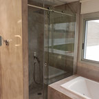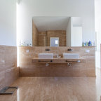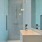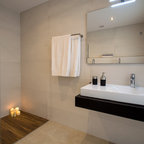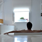 Inspiration för moderna vitt badrum, med öppna hyllor, vit kakel, keramikplattor, vita väggar och ett integrerad handfat — Houzz