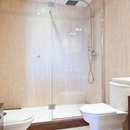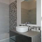 Exempel på ett klassiskt badrum, med öppna hyllor, en toalettstol med hel cisternkåpa, grå kakel och ett piedestal handfat — Houzz