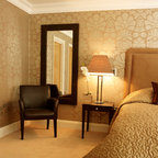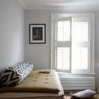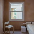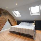 Inredning av ett modernt mycket stort huvudsovrum, med vita väggar och klinkergolv i porslin — Houzz