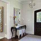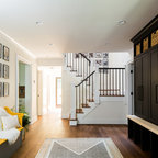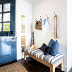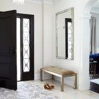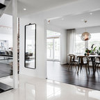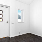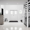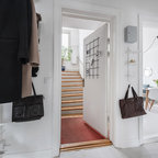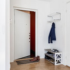 Idéer för skandinaviska ingångspartier, med vita väggar, vitt golv, en dubbeldörr och en vit dörr — Houzz