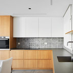 Modern inredning av ett mellanstort kök, med en undermonterad diskho, släta luckor, vita skåp, rostfria vitvaror, betonggolv, en köksö, bänkskiva i koppar och vitt stänkskydd — Houzz
