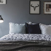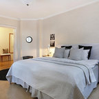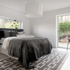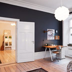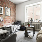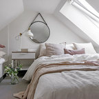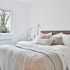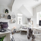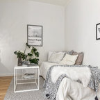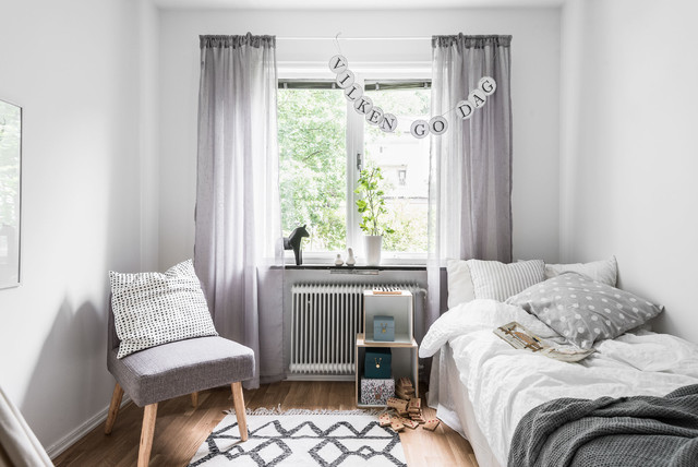Bild på ett mellanstort skandinaviskt gästrum, med vita väggar och mellanmörkt trägolv — Houzz