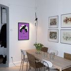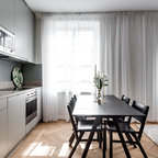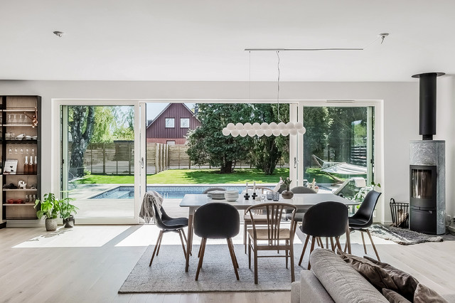 Nordisk inredning av en matplats med öppen planlösning, med grå väggar, ljust trägolv, en öppen vedspis och beiget golv — Houzz