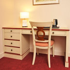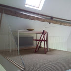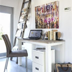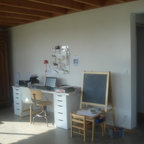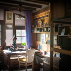 Inspiration för mellanstora lantliga hemmabibliotek, med beige väggar och ett fristående skrivbord — Houzz