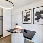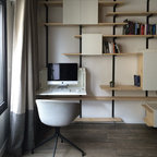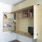Inspiration för ett funkis arbetsrum, med vita väggar, ljust trägolv, ett inbyggt skrivbord och beiget golv — Houzz