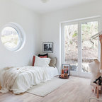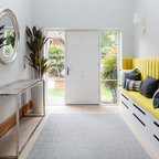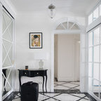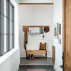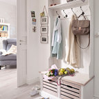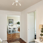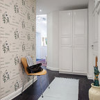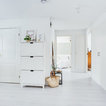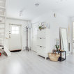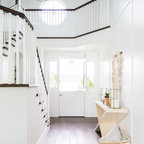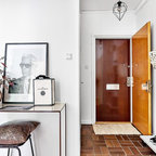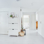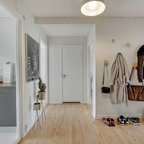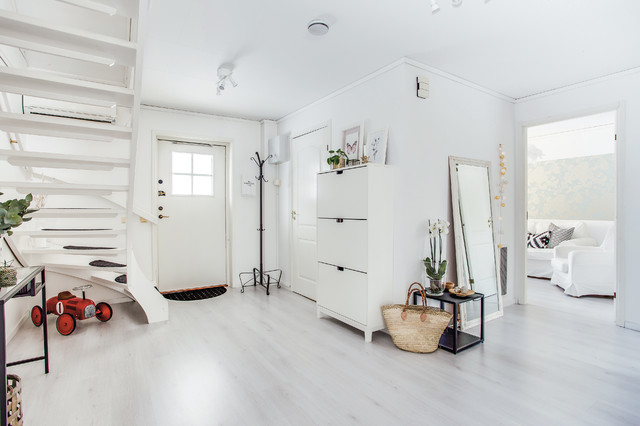 Idéer för en minimalistisk foajé, med vita väggar, ljust trägolv, en enkeldörr, en vit dörr och vitt golv — Houzz