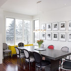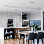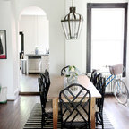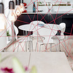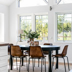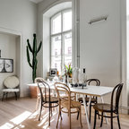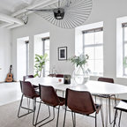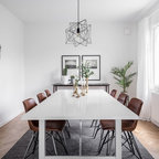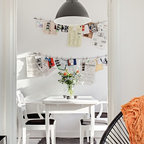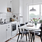 Foto på en mellanstor nordisk matplats med öppen planlösning, med vita väggar, betonggolv och grått golv — Houzz