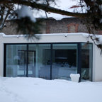 Foto på ett mellanstort funkis vitt hus, med tre eller fler plan, metallfasad och platt tak — Houzz