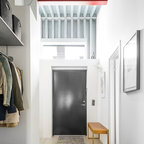 Idéer för industriella hallar, med vita väggar, en enkeldörr, en svart dörr och beiget golv — Houzz