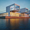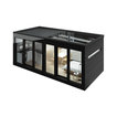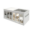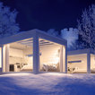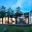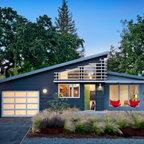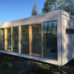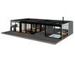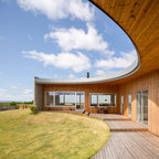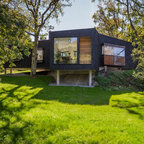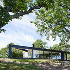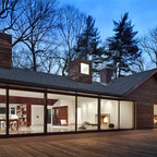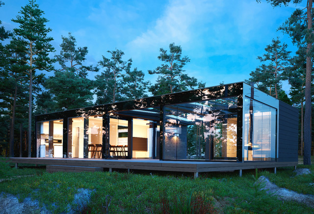 Inspiration för mellanstora minimalistiska bruna hus, med allt i ett plan, glasfasad och platt tak — Houzz