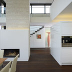 Modern inredning av ett mellanstort allrum med öppen planlösning, med vita väggar, mellanmörkt trägolv och brunt golv — Houzz