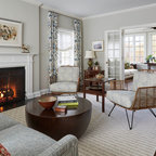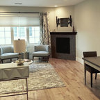 Foto på ett vintage separat vardagsrum, med vita väggar, mellanmörkt trägolv, en väggmonterad TV och brunt golv — Houzz