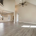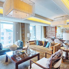 I like the multiple uses for the media area- tables and bench and the large photos flanking the TV