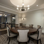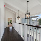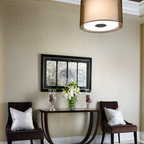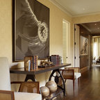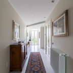 Klassisk inredning av en mellanstor hall, med grå väggar, mörkt trägolv och brunt golv — Houzz
