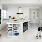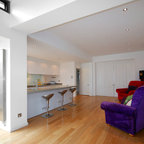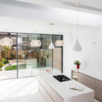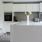 Bespoke Fulham pantry by Roundhouse in bespoke Urbo handleless matt lacquer kitchen in Farrow & Ball Skimming Stone and book matched horizontal Walnut veneer with Caesarstone quartz composite worktop and walnut breakfast bar.